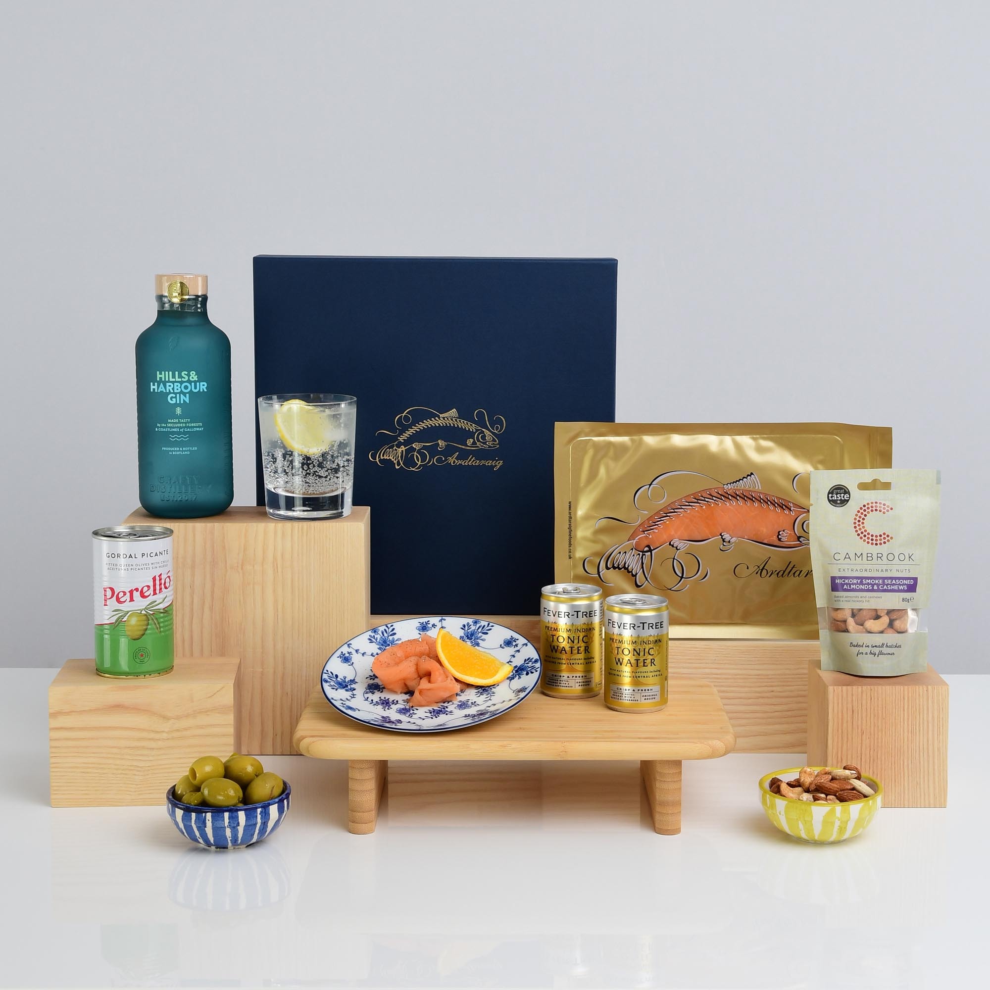Contents: Ardtaraig Gin & Orange Infused Smoked Scottish Salmon 200g Crafty Distillery - Hills & Harbour Gin 75cl Fever Tree Indian Tonic Water (2 x 150ml Cans)  Perello Gordal Pitted Olives Tin 150g  Cambrook Hickory...