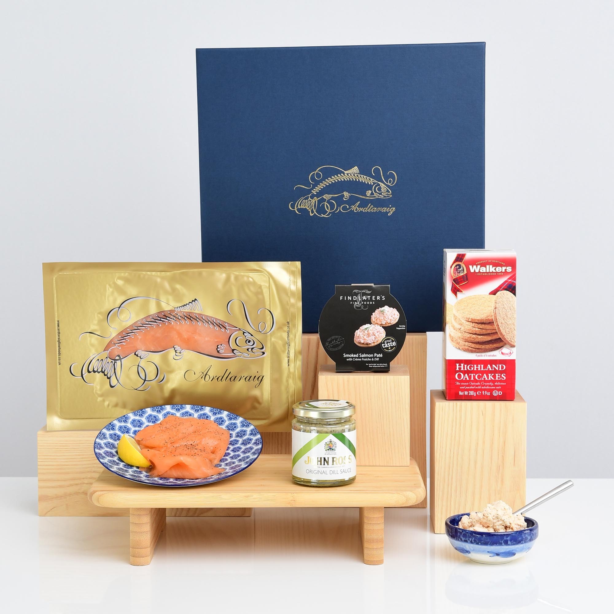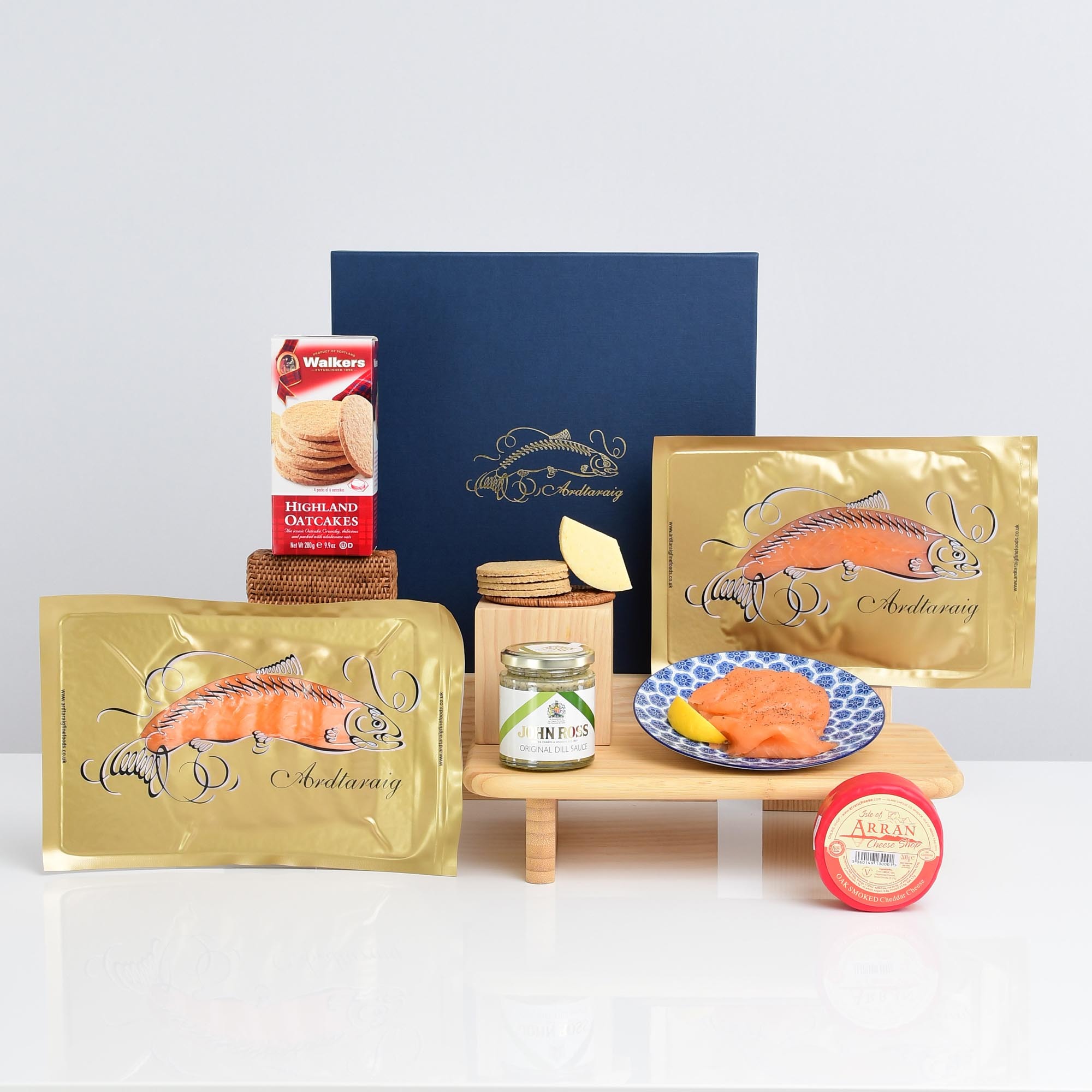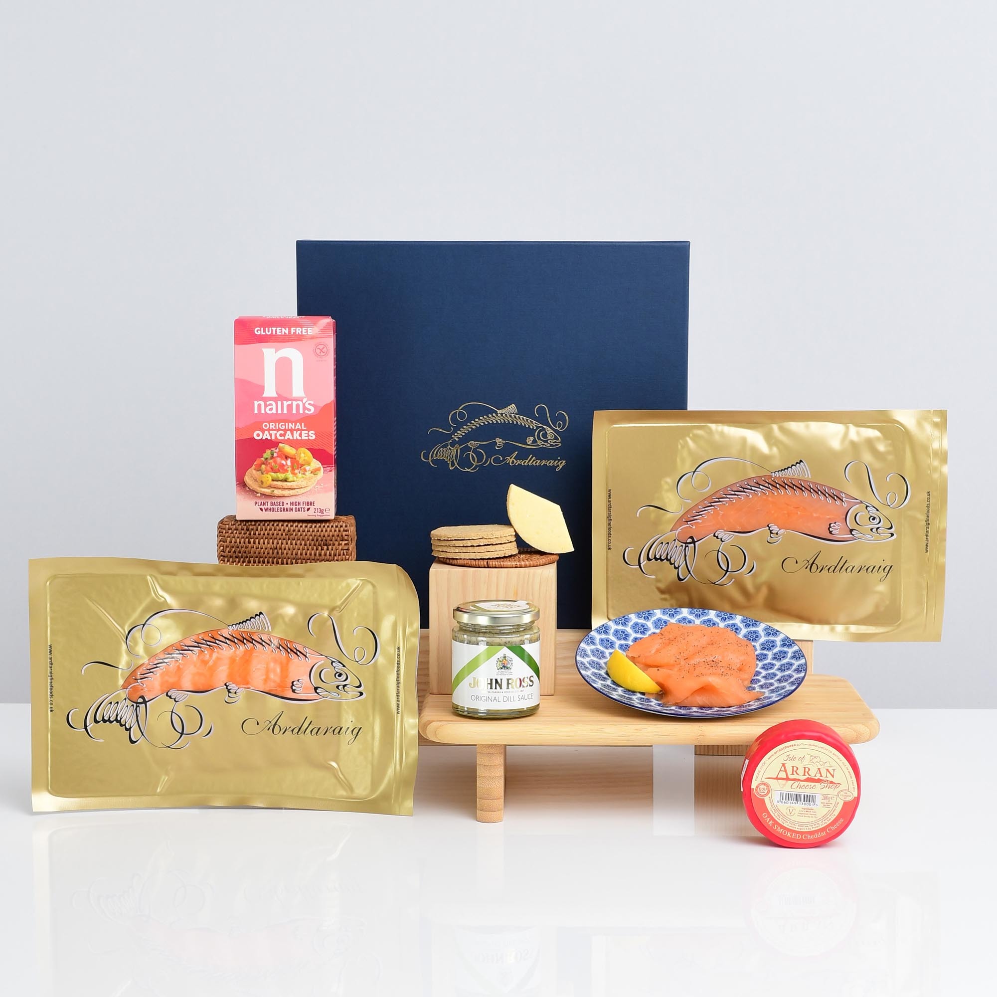 Contents: Ardtaraig Traditional Smoked Salmon 200g Ardtaraig Hot Roast Scottish Salmon Slices 180g  John Ross Dill & Mustard Sauce Jar 175g  Walkers Highland Oatcakes 280g Arran Cheese Smoked Mature Cheddar Wax Truckle...