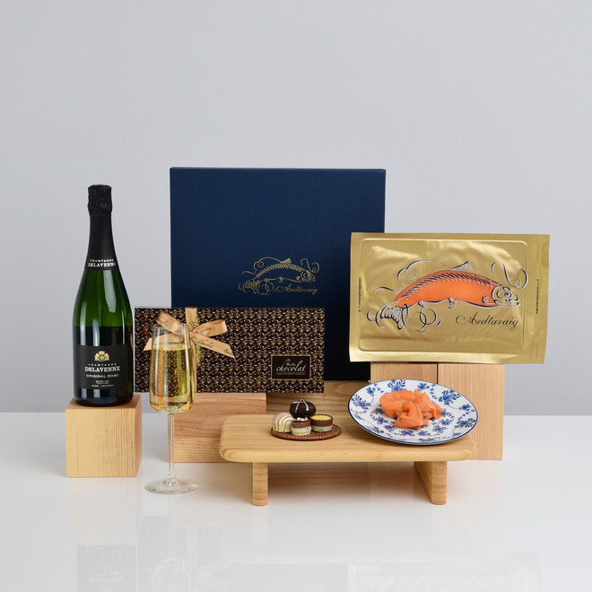 Champagne, Salmon & Chocolates A gift of true sophistication. This exquisite box brings together three icons of indulgence: the world’s finest Champagne, delicately hand-prepared Smoked Scottish Salmon, and artisanal Belgian Chocolates of unrivalled richness. Perfectly balanced between elegance and decadence, it is the ultimate expression of celebration — a gift designed to impress, delight, and linger long in memory.