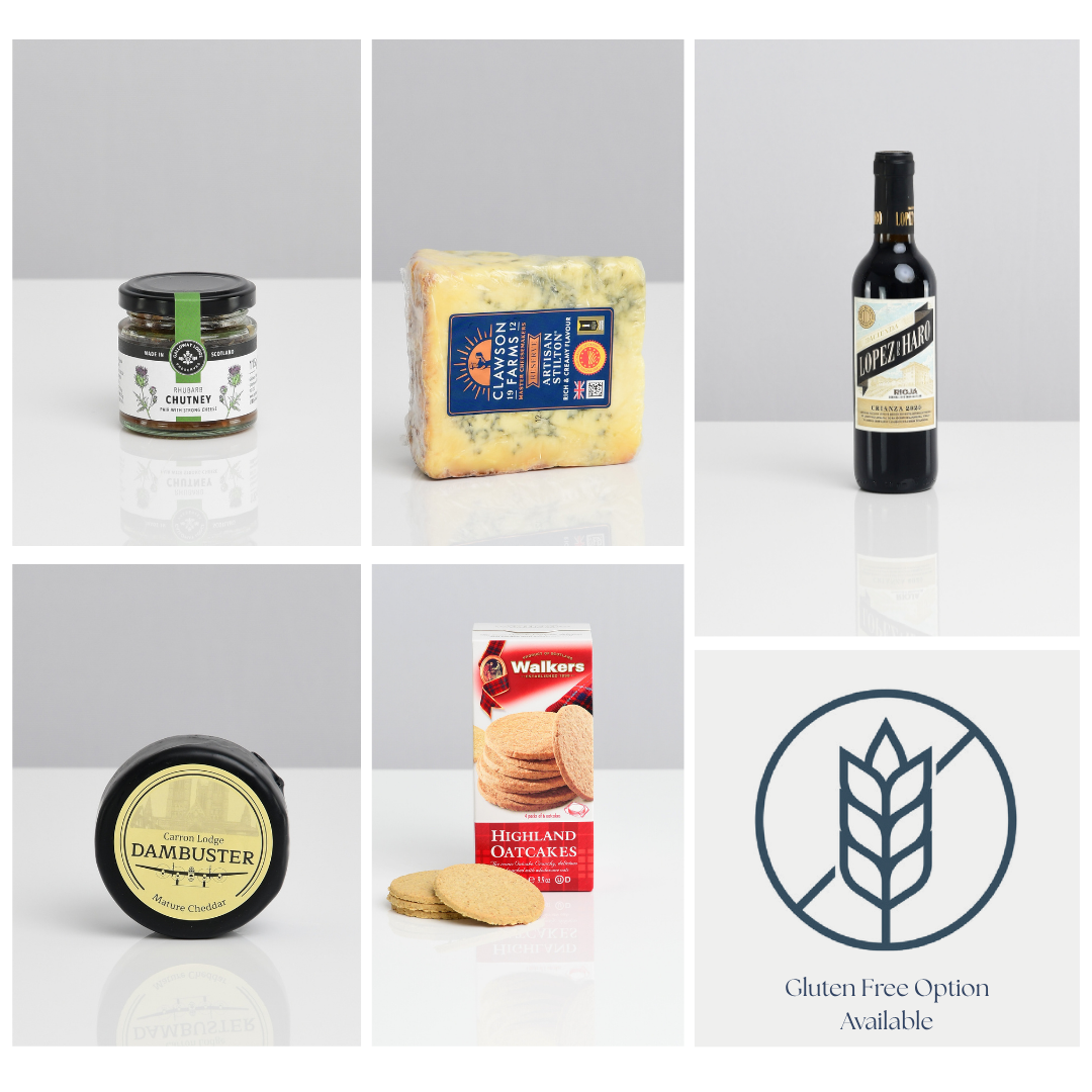 Cheese & Wine Tasting Box A half bottle of rich and super smooth Rioja from Spain, two classic cheeses and a very special Rhubarb chutney from Scotland finished with classic oatcakes. Red Wine and Cheese as it should be. |