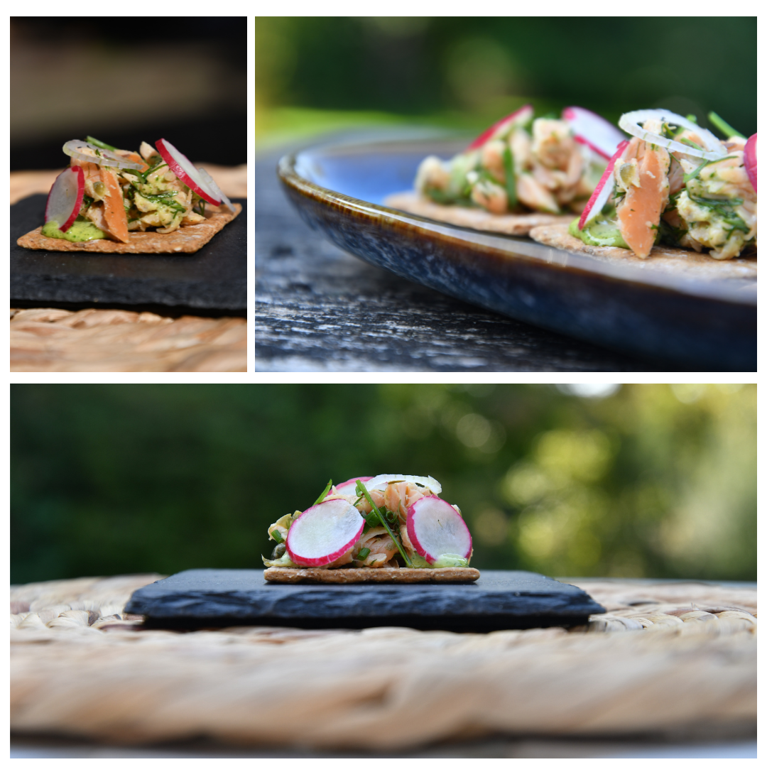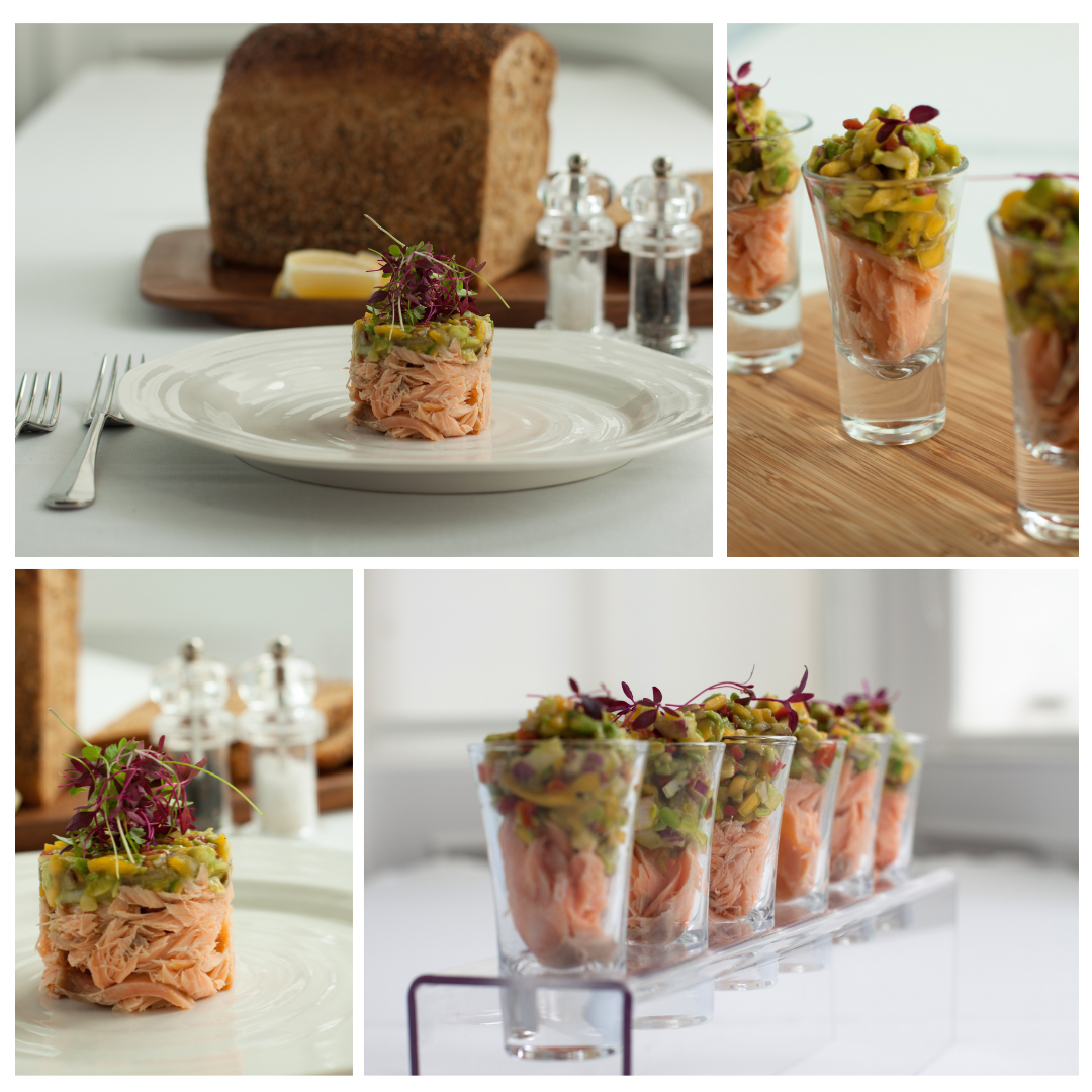 Hot Smoked Salmon with Mango & Avocado Salsa Starter This is one of our personal favourites and absolutely perfect for summer. We have prepared this as a starter in our photo, however we tend to mix this in a bowl like a salad and it is present at most Barbecues and outdoor meals we eat. It is also one of the first to disappear! We have also prepared it in a really fun way with shot glasses, which is great for nibbles at parties. All that is required to make this delicious dish is some of our Hot Smoked Salmon, ripe avocados for guacamole and mangos to be finely diced. Then mix together and add seasoning to taste. Click Here to order your Hot Smoked Salmon now. |