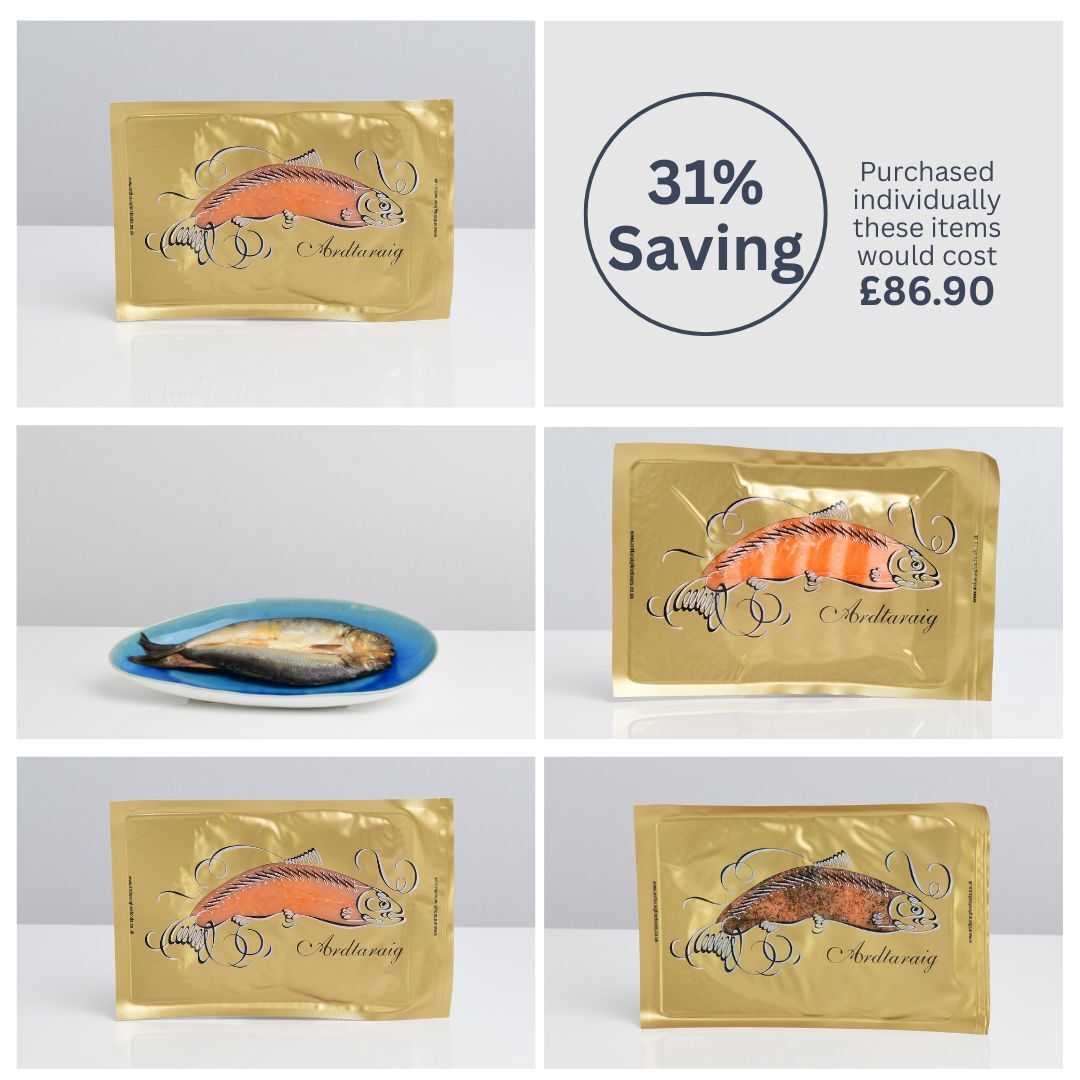 Smokery Selection 5 A selection of 5 of our most popular smoked and cured Scottish fish products.